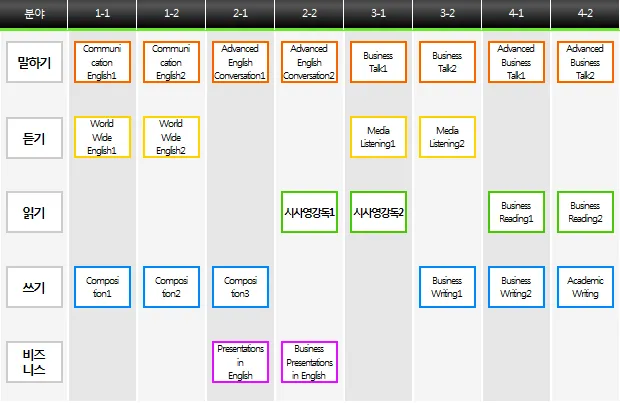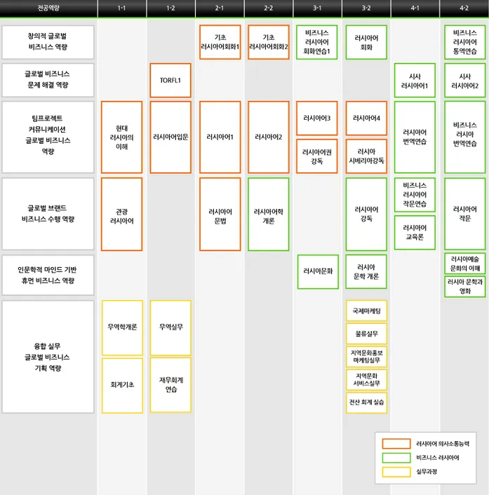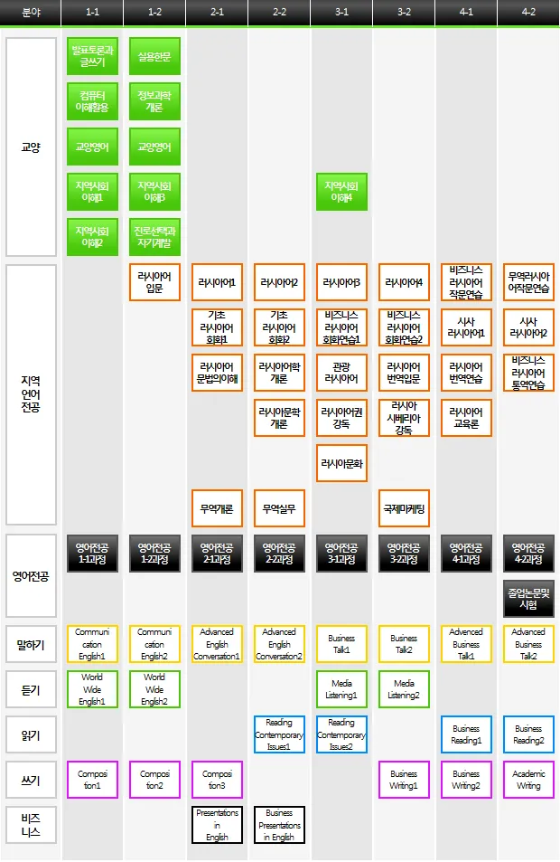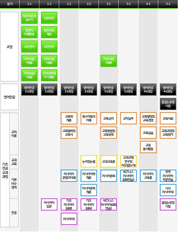 전공이수체계도 이수체계도상의 각 전공 교과목에 대한 상세설명은 전공교과목 페이지에서 확인하실 수 있습니다. 복수전공(영어전공+노어전공)이수자 이수체계도상의 각 전공 교과목에 대한 상세설명은 전공교과목 페이지에서 확인하실 수 있습니다. 노어전공 교직과정 이수자 이수체계도상의 각 전공 교과목에 대한 상세설명은 전공교과목 페이지에서 확인하실 수 있습니다. 영어전공 이수체계도상의 각 전공 교과목에 대한 상세설명은 전공교과목 페이지에서 확인하실 수 있습니다.
